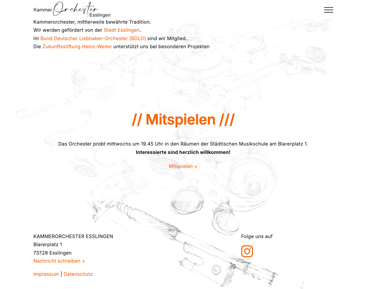 Fein illustrierte Zeichnungen als Hintergrundgrafiken verleihen der Website eine persönliche, künstlerische Note und spiegeln die handwerkliche Tiefe der Musik wider.